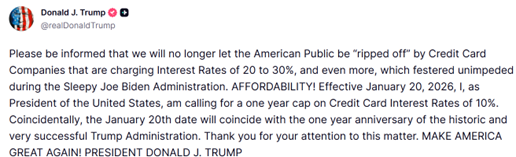 Javelin commented on this topic in September 2024, when candidate Trump raised the 10% rate cap during his presidential campaign. (See: Market-Drive, Risk-Based Credit Card Price Controls Would Disrupt Borrowing and Lending). In that report, we suggested that credit card lending (and borrowing) would essentially stall because the rate would create losses for all issuers. Were it to happen, our simulation showed that credit card lenders would lose billions, ending with a potential 6.4% negative return on assets in a steady state.